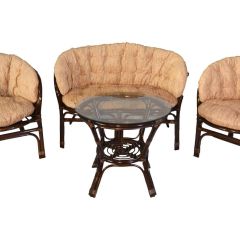 Комплект из натурального ротанга, состоящий из дивана, двух кресел и круглого столика со стеклом.